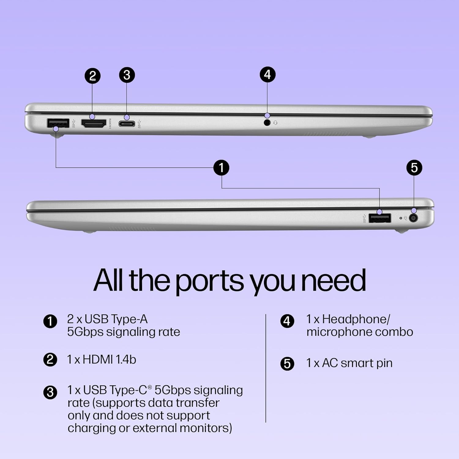 - Ports & Connectivity :1 USB Type-C 5Gbps signaling rate (supports data transfer only and does not support charging or external monitors); 2 USB Type-A 5Gbps signaling rate; 1 AC smart pin; 1 HDMI 1.4b; 1 headphone/microphone combo| Connectivity: Realtek Wi-Fi 6 (2x2) and Bluetooth 5.3 wireless card (supporting gigabit data rate)
