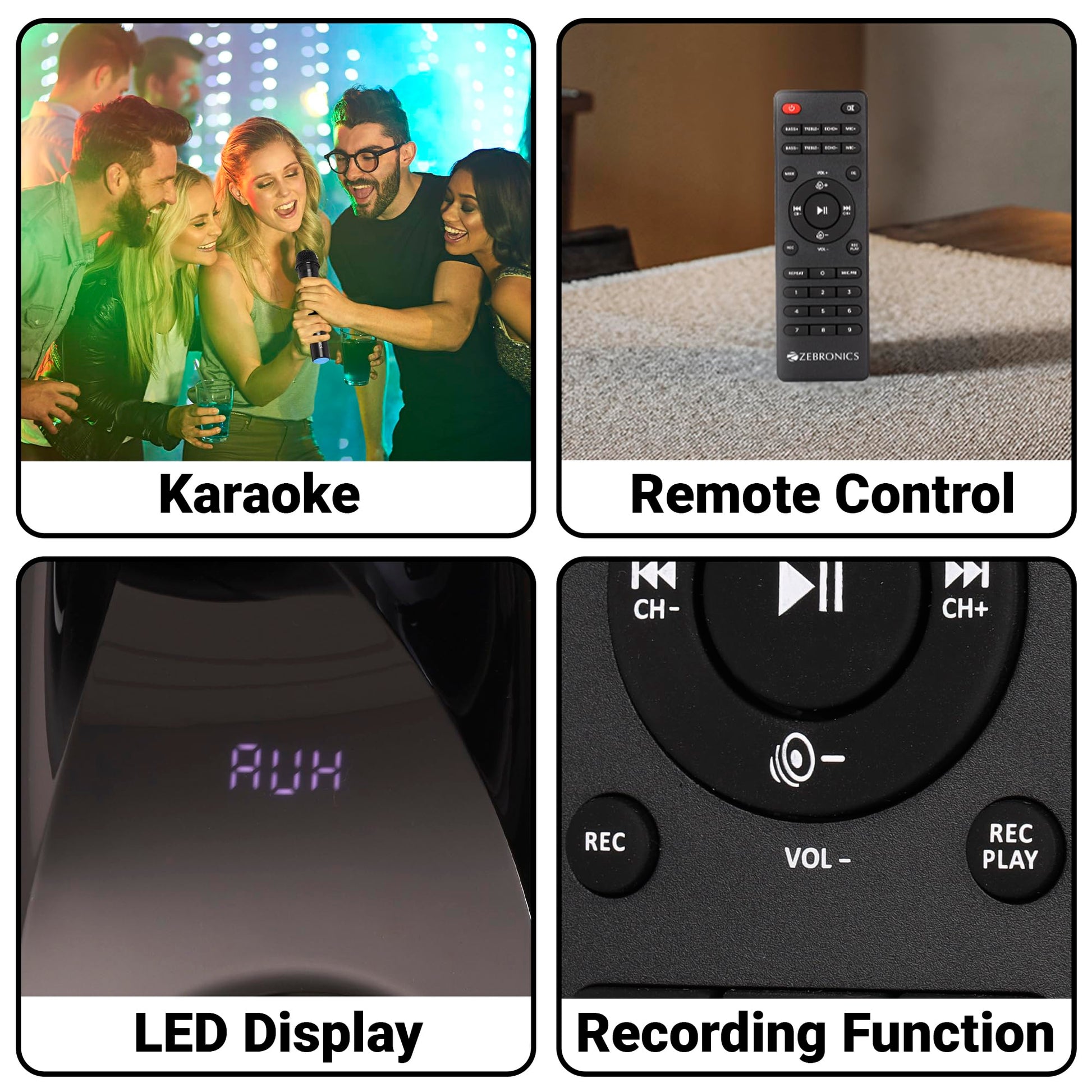 - Bluetooth v5.0 | AUX 3.5mm | USB Pendrive | micro SD card input | FM radio function.;Karaoke | 2x wireless mic inside package | Recording for mic input | Support for connecting 2x 6.3mm Wired mic.