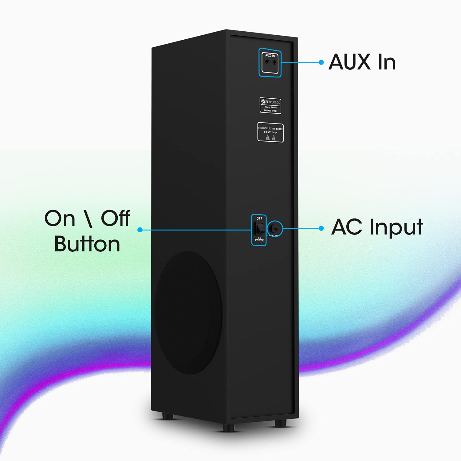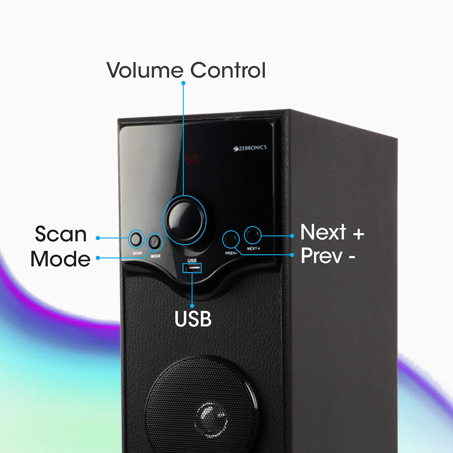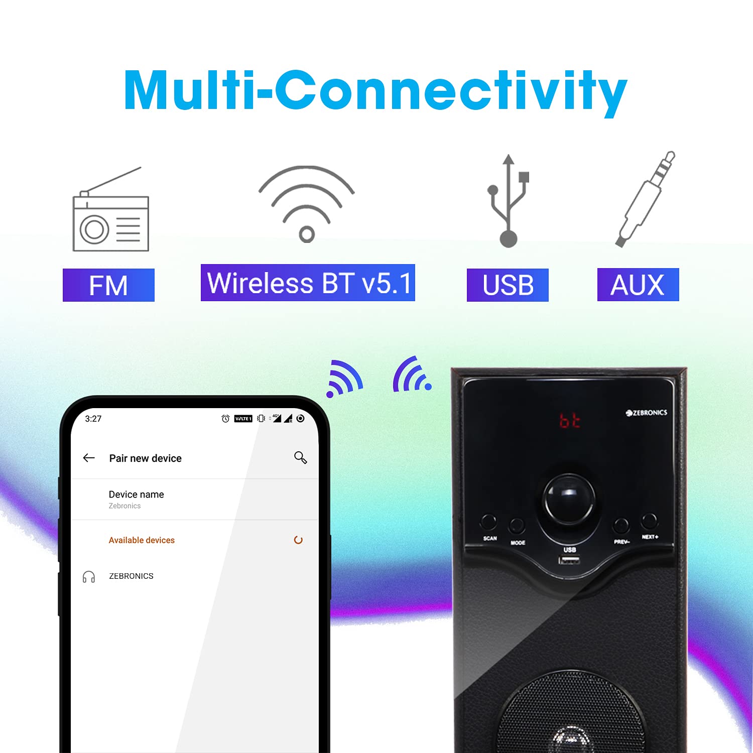 - - Dual 7.62cms full range drivers with wide frequency for perfect music listening experience;- Play songs via Bluetooth v5.1, AUX in 3.5mm Jack, USB Pen Drive, built in FM Radio